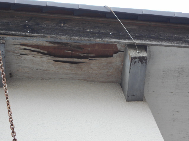 奈良市古市町で入り口に運送会社のトラックが接触し、庇が破損したことから庇の施工と外壁張り替え工事を行っています。前回のブログでは、新しい外壁下地材を設置して外壁材の大波スレートを施工しました。今回は、単管足場を解体して、新しい庇を設置します。 単管足場を解体します ...続きを読む2022/04/28 白山市の某工場の雨漏り調査。サビが原因で穴が空いてました。