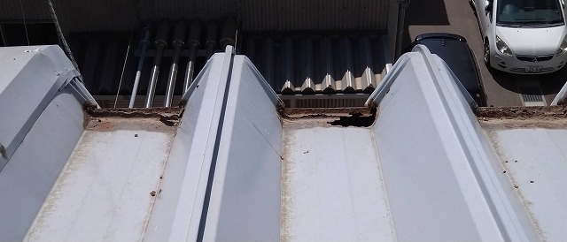 岐阜市にお住いのお客様から「屋根の瓦が全体に白くなってきています。一度見てほしい」とのご相談をいただきました。早速調査に伺いました。屋根はU瓦でした。U瓦は現在販売されていません。U瓦は有機繊維強化セメントというものでシリコン樹脂で着色しています。屋根材は20年前に非常に普及した瓦です。 ...続きを読む2022/04/28 岐阜市にて倉庫の屋根金属製波トタンの錆がひどくボロボロになってしまっていました