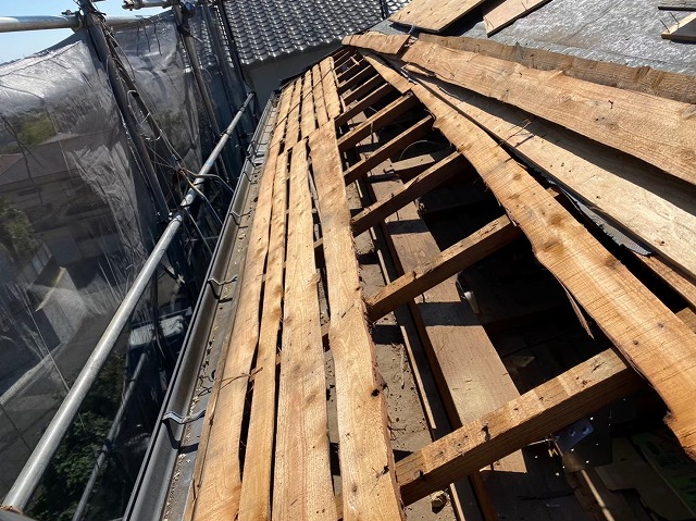 四国中央市にお住いのお客様より「やまじ風」の突風で屋根のスレートが飛んだから屋根補修してほしい。とお問い合わせをいただきました。早速、屋根調査にうかがうと屋根のスレートが飛んだり浮いたりしているほか破損しているものもありました。今回は突風「やまじ風」に被災した屋根の調査の様子をご紹介します。屋根にお悩みのある ...続きを読む2022/04/28 生駒市葺き替え工事で屋根材設置前の土台の野地板と防水紙について