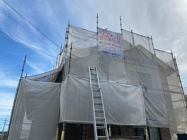 お問い合わせのきっかけ 東大阪市で台風被害を受けた方からスレート屋根の修理のご依頼いただきました。現在雨漏りはしていないそうですが、屋根の部品が飛んでしまいとても不安を抱いていらっしゃいました。 今回はスレート屋根の破風(ハフ)という部分が台風の影響で飛んでしまったそうな ...続きを読む2022/04/28 東大阪市で雨漏りしたので、雨漏り補修の為足場組立と点検をおこないました。