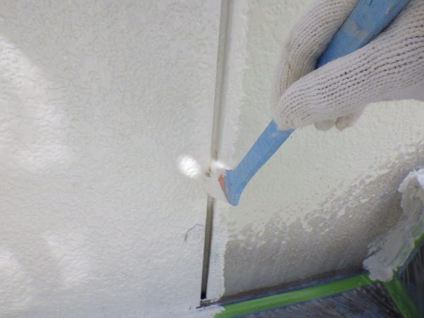 宇都宮市の外壁塗装工事でリシン壁の下、中塗り塗装をしました。 軒天1回目塗装中です。 外壁面と破風板の見返し部分を刷毛で塗装してから、表面の広い部分をローラーで塗装していきます。 ...続きを読む2022/04/19 宇都宮市で軒天と外壁面以外の場所をマスカーテープで覆いました