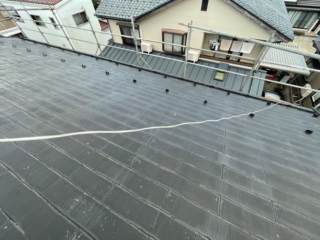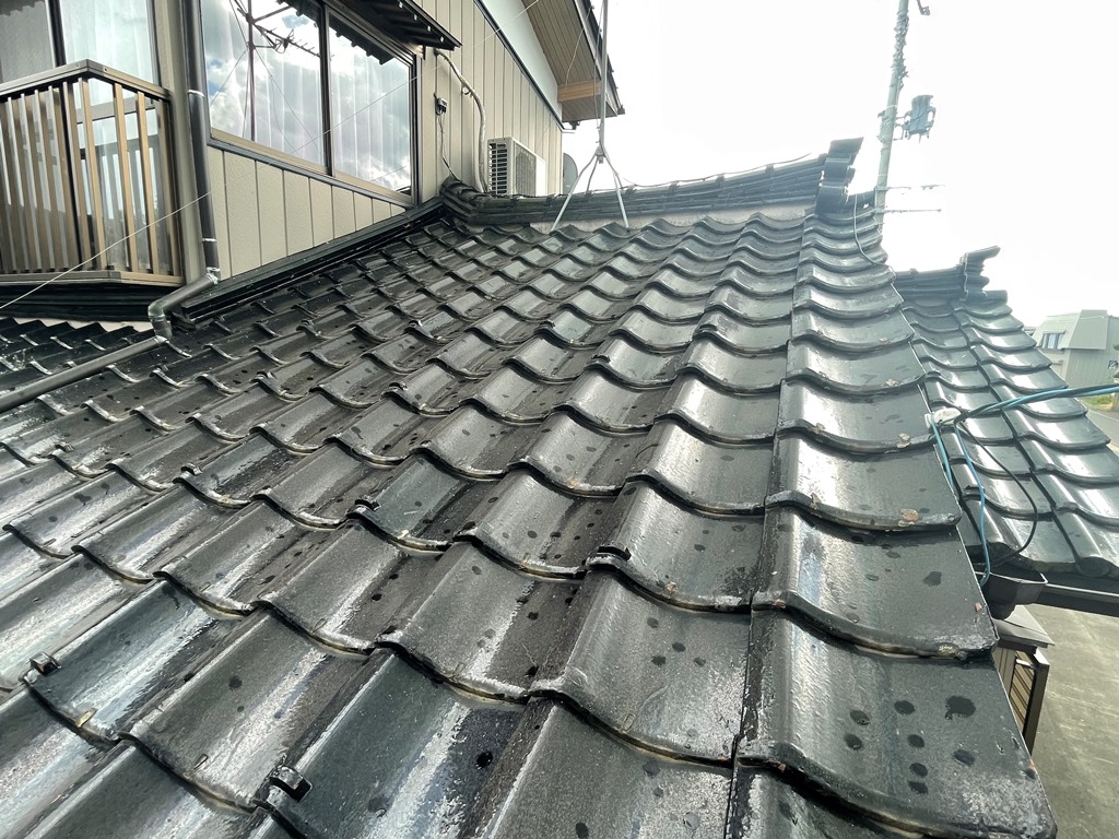 鹿児島市にて屋根の塗装工事を行っております!今回は2階だてスレート屋根の建物です。施工前の屋根は塗膜の劣化により褪色は起こっているものの、ひび割れや欠けなどの不具合は見られませんでした。 まずは高圧洗浄の様子です。高圧洗浄は屋根に付着している汚れをキレイに ...続きを読む2022/04/7 大阪狭山市にてケラバ瓦が下屋に落下した屋根の現地調査