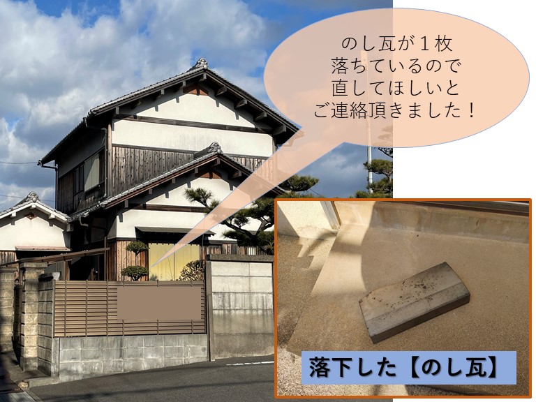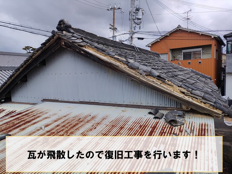 今回は名古屋市名東区で1年前にアイジー工業のスーパーガルテクトで屋根の重ね葺き工事を行った家の点検に行ってきました。決まった年数でDMを送らせて頂きご希望の方は点検を行い、写真をまとめて提出しています!この様に定期的に点検する事で万が一問題があった場合に早期発見ができ、対応する事が出来ます。それでは点検の様子 ...続きを読む2022/03/8 岩出市でのし瓦や袖瓦が飛散!屋根瓦の修理はお任せください★