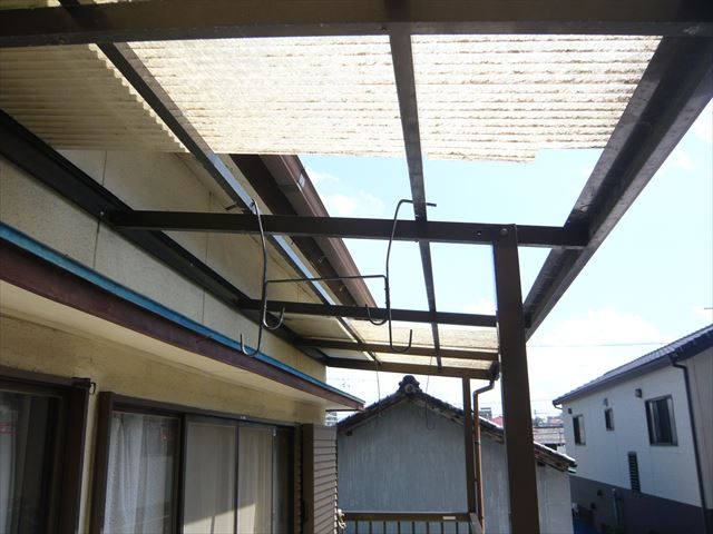 八尾市で築年数40年以上経つ戸建て住宅より、老朽化によりベランダや壁の補修をしてほしいとの依頼がありました。 現場調査では、施主様が補修されてる箇所が数か所ありましたが、タイルが落ちそうになっていたところがあり、そこから雨が侵入し雨漏れしていました。 ...続きを読む2022/02/27 八尾市でベランダの波板と樋が飛んだ。木枠の屋根に取付工事