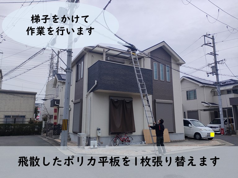 皆さんこんにちは。街の屋根やさん飯田・伊那店の下平です。今回のブログは前回に引き続き、飯田市内でおこなっている遮熱塗料を使った外壁塗装をおこなっている現場からです。前回までに外壁のカバー工事やコーキング打ち替え作業を終えて、打ち替えしたコーキングの乾燥期間を経て、いよいよ次の工程に着手していき ...続きを読む2022/02/13 紀の川市でポリカ平板(かすみ色)が飛散した部分だけ張り替えました