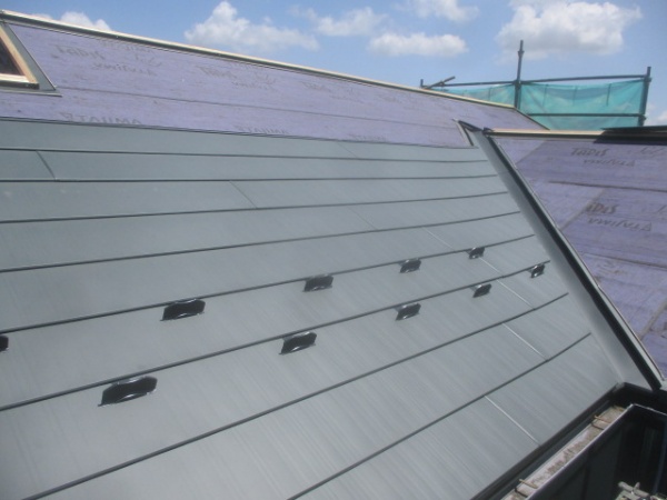 宇都宮市のスレート屋根カバー工事で横暖ルーフSを葺きました。 昨日途中まで終了していた南面の雪止め取り付けが終了して、棟に向かってルーフを葺き上げていきます。 左右の谷樋の取り合いでルーフを繋ぎますので、有効幅を255ミリにして固定していきます。 ...続きを読む2022/02/9 今治市松本町で増築リフォームの板金屋根の工事をしました