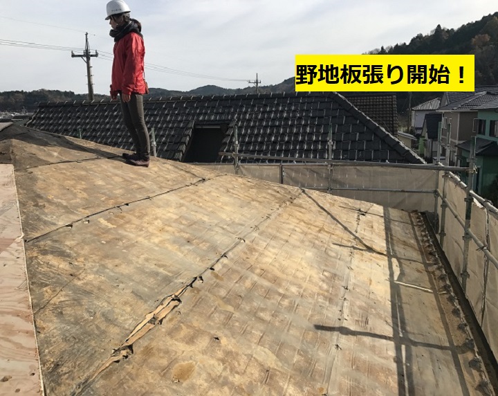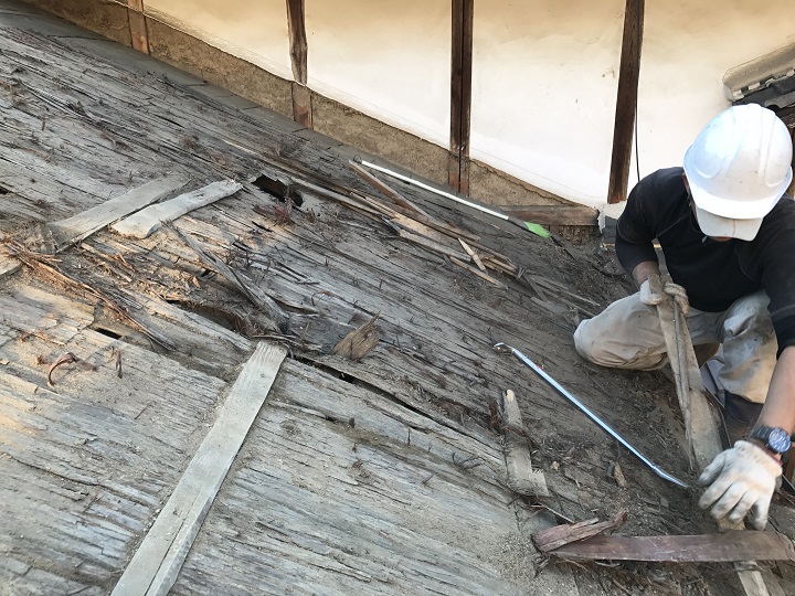 名張市で築70年の日本家屋の屋根の葺き替え工事をしています。 ①点検編はこちらから ②瓦おろし編はこちらから ③屋根土おろし編はこちらから 本日は杉皮と桟を剥がし古い野地板の上に新しい野地板を取り付けていきます。 ...続きを読む2026/01/16 伊賀市で葺き替え工事/屋根全体に野地板を張りました。