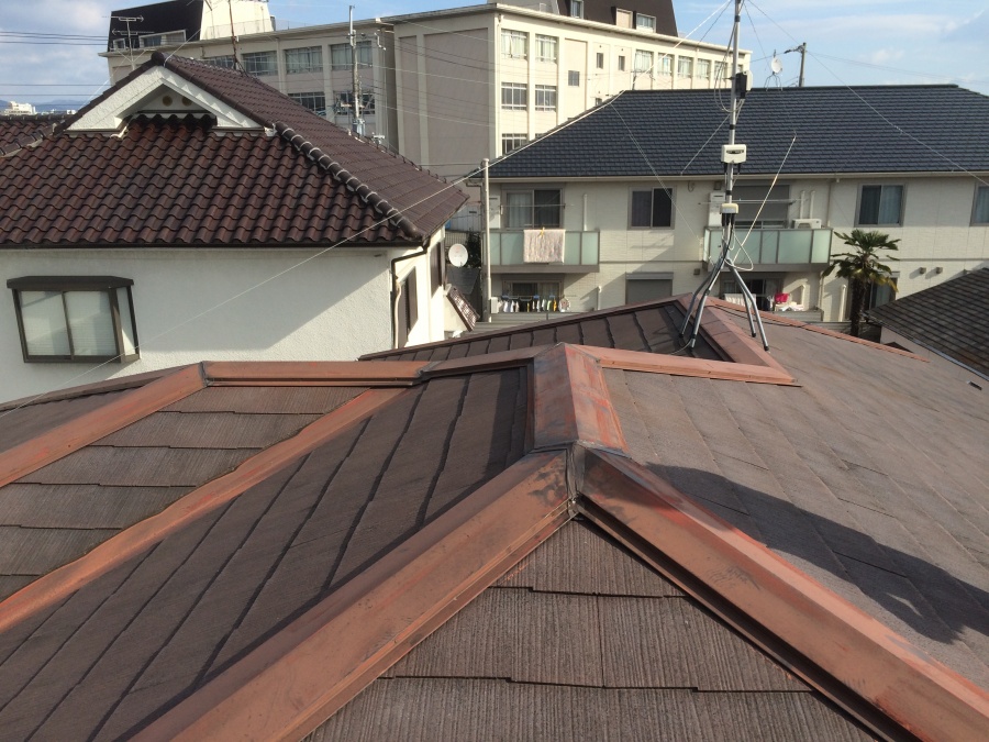 今回の現場ブログは、三田市にお住まいの方から屋根の葺き替えを検討中なので、一度調査をお願いしたいと、依頼が入りましたので、現場に調査に行ってまいりました!それでは調査の様子をご覧ください! こちらが現場の屋根の様子です。屋根勾配(傾斜)が複雑に入り組んでいる ...続きを読む2022/01/27 宮崎市本郷にてU様邸の和形セメント瓦屋根の雨漏り補修工事 No.2