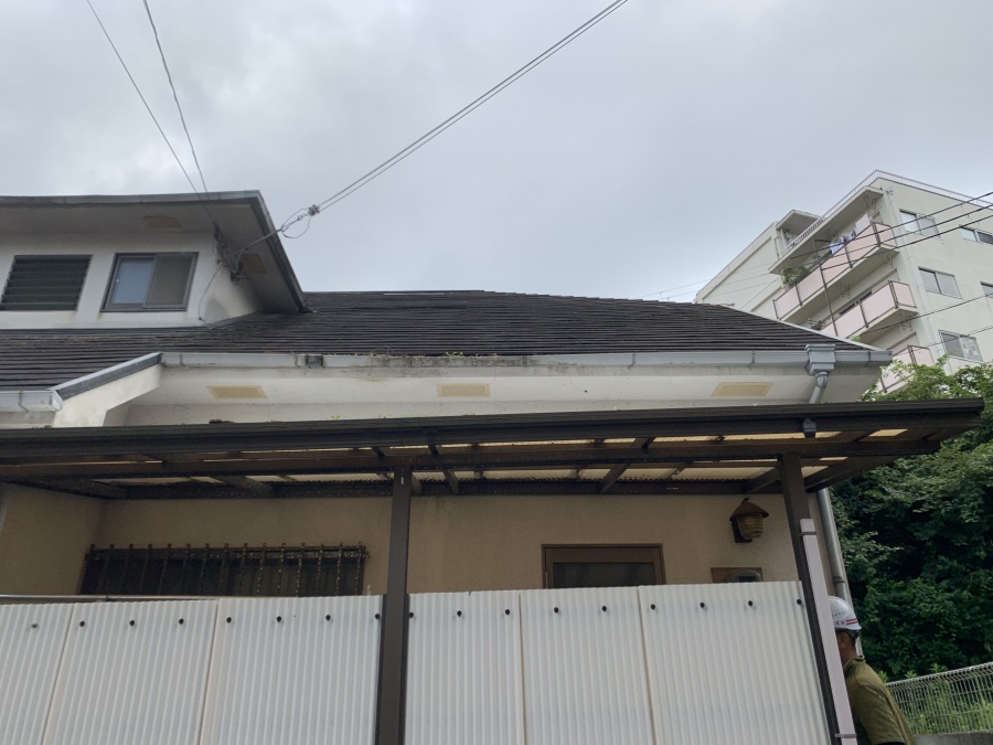神戸市灘区のT様より、台風被害により棟瓦が飛んので、見て欲しいというご依頼を頂き調査に伺いました。写真をご覧いただければ解る通り棟瓦の部分が飛散してしまっています。この瓦は平板瓦と言って、昔からある従来の日本瓦とは少し仕様が違っており、一つずつの瓦をひっかけざんによって止めているのが特徴です。従 ...続きを読む2022/01/20 八尾市で外壁塗装工事足場組立前の準備