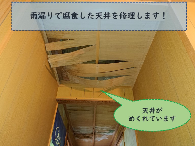 【相談内容】近くで工事をしている業者から屋根が浮いていると言われた 緑区のお客様から屋根を見て欲しいとのご依頼を受け伺いました。近くで工事中の業者から「屋根が浮いている」と指摘され、不安になったとのことです。早速、ドローンを飛ばし屋根に異常がないか確認を行 ...続きを読む2022/01/6 紀の川市で雨染みが付いた天井板と、めくれた天井板を張替えました