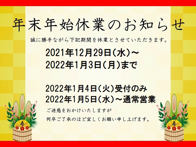 【年末年始のお知らせ】平素は格別なご高配を賜り、誠にありがとうございます。街の屋根やさん水戸店は、誠に勝手ながら年末年始休業を下記の通りといたします。年末年始休業日2021年12月29日(水)~2022年1月3日(月)2022年1月4日(火)受付業務のみとさせて頂きます。2022年1月5日(水 ...続きを読む2021/12/28 滋賀の皆さんへ、年末年始のお知らせ