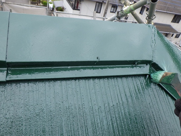 宇都宮市のコロニアル屋根塗装工事で中塗り塗装をしました。 屋根の板金部の中塗り刷毛塗装中です。 谷樋とスレート屋根材の取り合いに刷毛で塗料を塗り込みながら、谷樋を中塗りしていきます。 屋根材の下まで刷毛を押し込み、塗り残しがないように塗装しました。 ...続きを読む2021/12/14 宇都宮市の屋根塗装工事で金属部の錆止め塗装をしました。