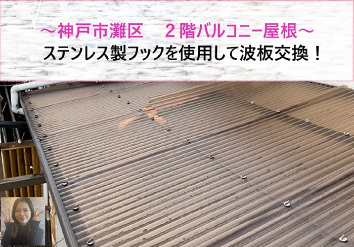 小山市のみなさん、こんにちは。街の屋根やさん栃木小山店です。本日は、ガレージの折板屋根の無料調査をご紹介します。折板屋根などの金属屋根材は、冬場の結露と切っても切れません。もちろん、結露を防ぐために『裏ポリ(ぺフ)』が使用されているのですが、やはり経年劣化すると・・・ガレージや倉庫の金属屋根で結露にお悩みの方 ...続きを読む2025/10/7 神戸市灘区 ステンレス製のフックを使用して2階バルコニー屋根の波板交換【サキブログ】