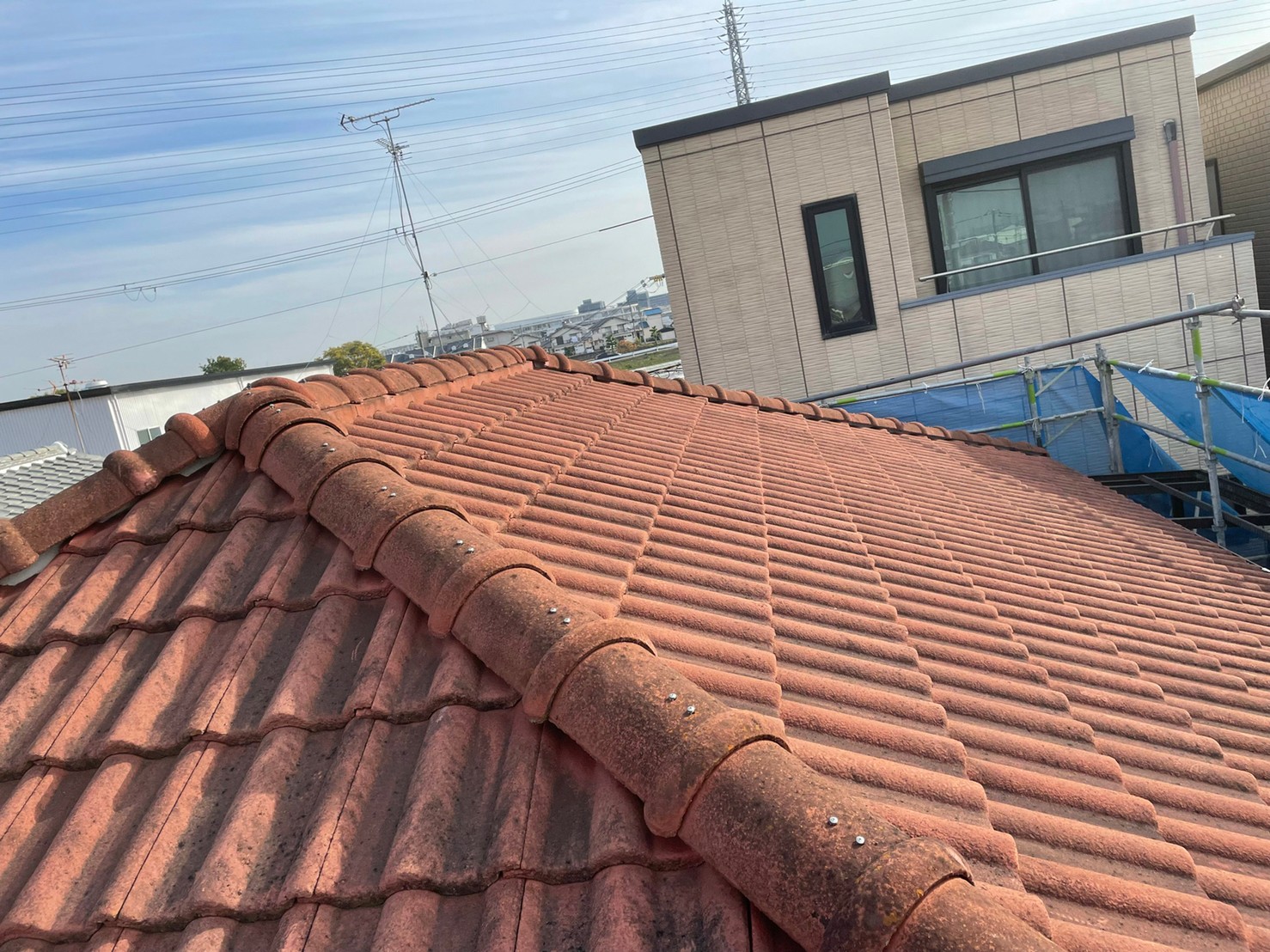岐阜市にお住まいのI様は、屋根の部材が庭に落ちてきてしまったので調査と、どういう対処が出来るかを提案してほしいとお問い合わせをくださいました。調査のため屋根に上がらせていただくと、割れていて今にも落ちてしまいそうなスレート屋根材が目に入りました。 ...続きを読む2021/12/7 名古屋市名東区にて雨で歪み始めた瓦屋根の棟積み直し工事が開始