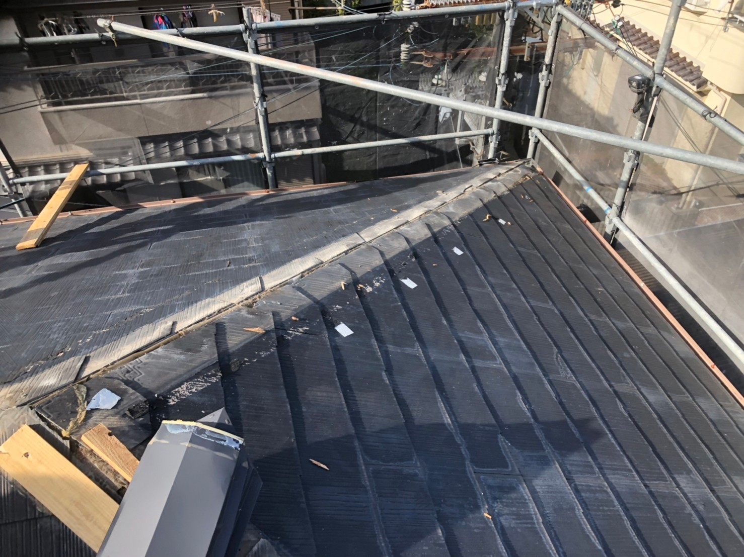 こんにちは!街の屋根やさん京都南店です!本日は向日市にてカバー工法による屋根重ね葺き工事をご紹介します。現状屋根はスレート瓦コロニアルです。ここにIG工業のスーパーガルテクトをカバー工法にて屋根工事を行います。また、お隣の外壁取り合い部分から雨漏れもありますので今回の工事でしっかりと解消を行い ...続きを読む2021/12/7 城陽市で増築部にガルバリウム鋼板立平葺きと雨樋交換の屋根工事