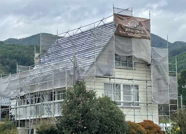みなさまこんにちは!今回ご紹介する現場ブログは厚型スレートの簡易補修についてご紹介します。岩出市在住のF様より雨漏り調査の依頼を受けました。調査をすると、雨漏りの原因となりそうな部分が数ヵ所あり「下屋のスレートひび割れ補修」「ベランダ防水工事」「壁際水切り設置工事」をご提案させていただきました。後日F様とご相 ...続きを読む2021/10/28 飯田市周辺の方に 蔵修繕工事!瓦屋根からガルバリウム鋼板屋根へ葺き替えへ!
