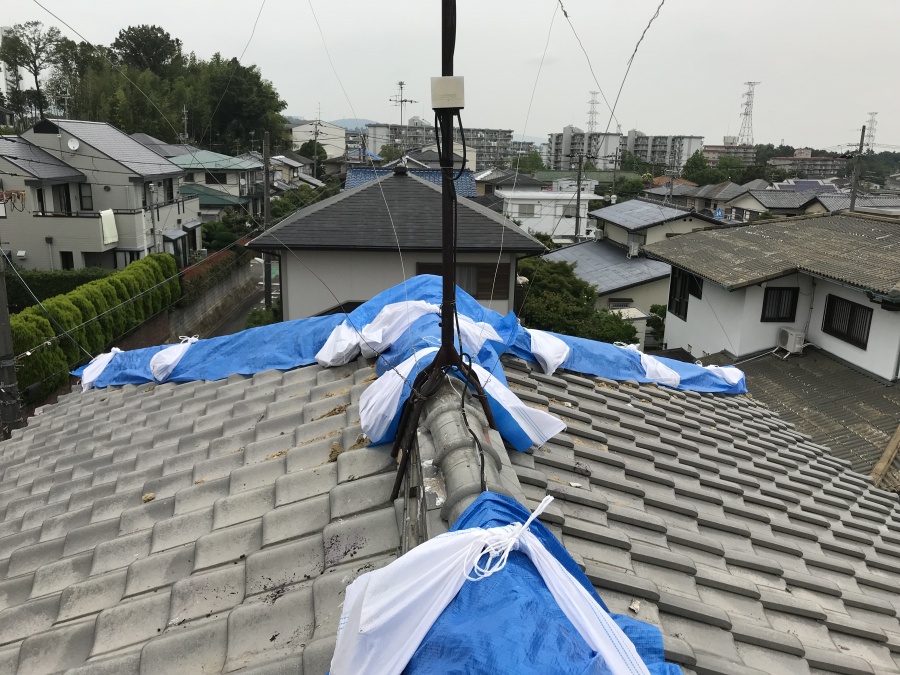 宇都宮市で板金や木部、スレート屋根の中塗りをしました。 外壁中塗り用の養生をしました。 軒天との取り合いの見切り線を真っすぐに仕上げるために、軒天側にマスキングテープを直線状に貼りました。 ...続きを読む2021/10/29 箕面市 雨漏り応急処置!屋根の崩れをブルーシートで養生