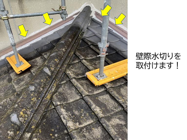 泉南市E様邸でモニエル瓦と外壁塗装工事を行なうことになりました。E様邸はモニエル瓦というセメント瓦を葺いていて、棟瓦(むねかわら)の隙間を埋めるために漆喰(しっくい)が詰められていました。棟とは・・屋根の頂点部分のことで、棟に葺く瓦を棟瓦と言います漆喰とは・・瓦を固定したり隙間を埋める建材のこと屋根を点検する ...続きを読む2025/10/6 岸和田市の雨漏り修理で壁際水切りを取付!板金工事もお任せください