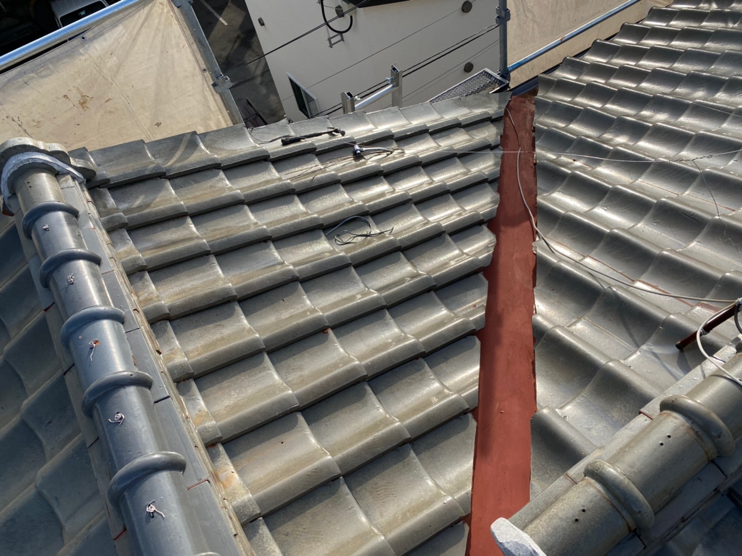 松戸市稔台にて、一昨年の台風の際に棟板金が被災してしまったので火災保険を使用した棟板金の復旧工事を行いました。 被害を受けた棟板金は、ガレージの屋根の部分で2.5m程の棟板金が飛散してしまい、下地の貫板が露出してしまっている状態でした。台風から月日が経過しているので、雨ざらしになっていた貫板には腐食が多く見ら ...続きを読む2021/09/10 豊明市にて平板瓦の屋根の定期点検を行いました。