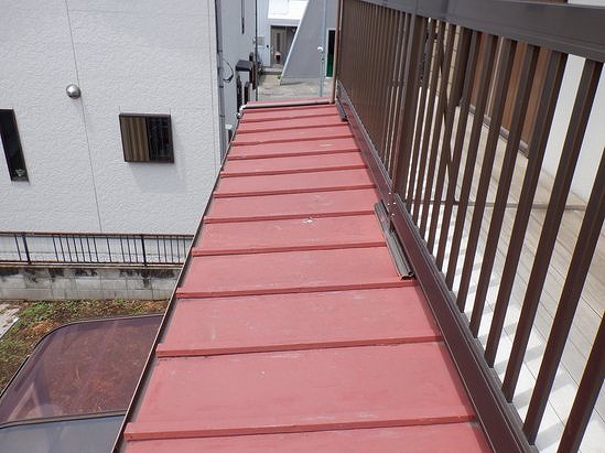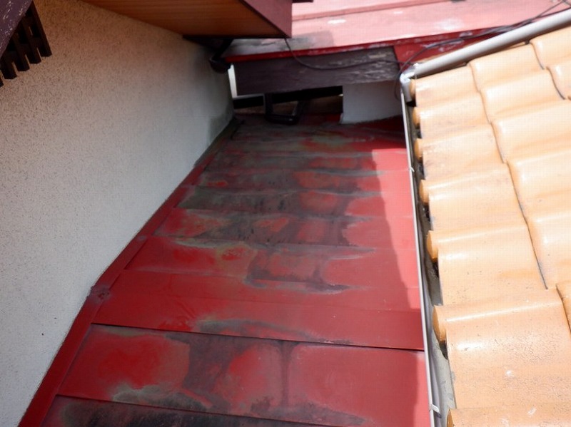 高崎市のお客様の屋根を調査しています。写真はベランダのある板金屋根です。板金屋根は赤く塗装されていますがところどころ塗装の膜が剥がれてしまっています。塗装が剥がれて下地が露出するとサビやサビによる腐食の穴ができたりして雨漏りの一因にもなります。屋根を長持ちさせるためにも板金屋根は塗装し直してお ...続きを読む2021/09/9 高崎市で雨漏りした所にシーリング剤を塗られた横葺きの板金屋根