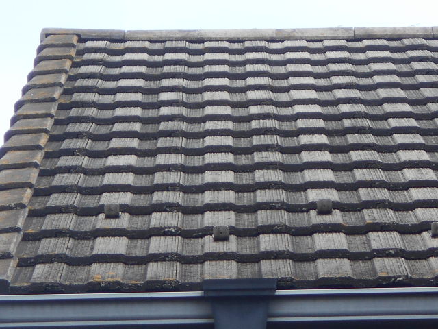 2021/08/30  大垣市 モニエル瓦のスラリー層が剝がれ落ちて素地が出ています。塗装工事の提案