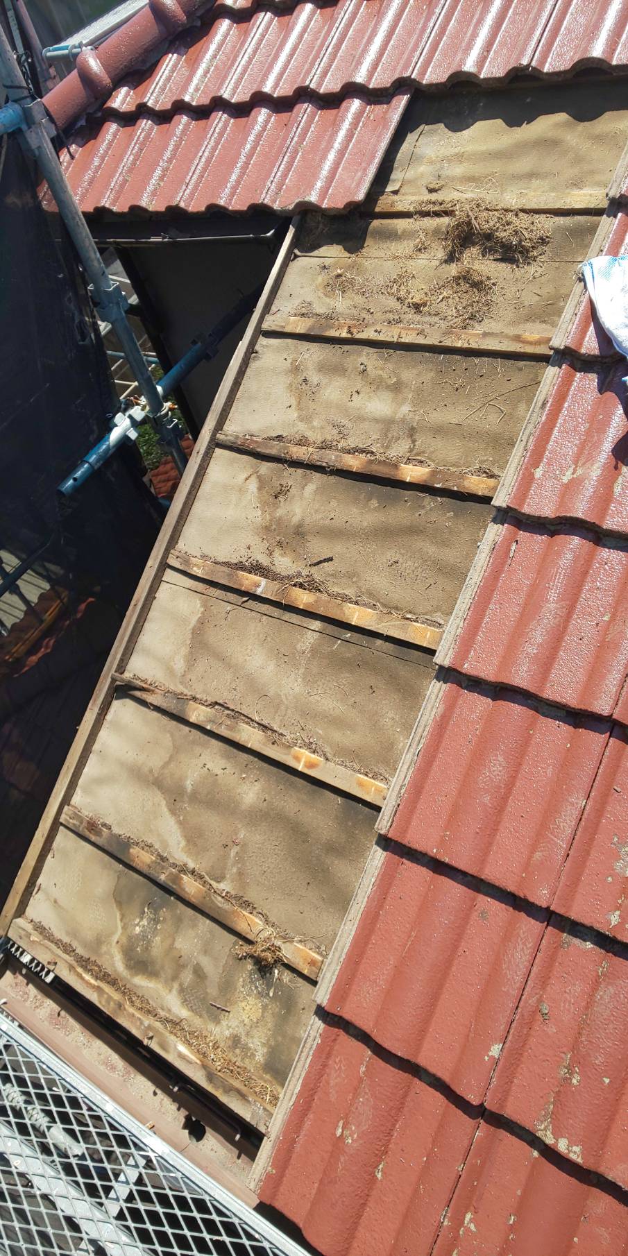 角田市のお宅の庭に建てられている物置小屋の波板屋根を葺き替え工事に行った時のことを紹介していきます。お客様が軒先の裏側から錆の進行が始まって来たのを発見しその後他の部分からの雨漏りが起きたのをきっかけにご相談頂きました。既存の屋根はトタンの波板が使われていて屋根材を固定する傘釘の劣化部分から雨漏りが発生してい ...続きを読む2021/07/27 鴻巣市で瓦屋根の部分葺き直しと塗装工事を行いました