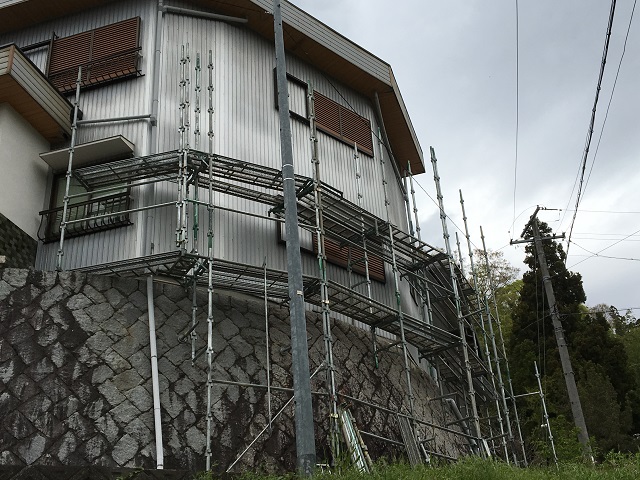 前回点検にお伺いした、伊賀市に建つH様邸。 一軒家としては珍しく、陸屋根(りくやね/ろくやね)と呼ばれる、平たい屋根をお持ちです。 (「陸」とは水平を意味する。)外壁にはトタンを使用しています。 まずは足場を設置します。 住宅自体は2階建てですが、約5メートル(1.5階分)の石垣の ...続きを読む2021/07/8 安城市にて経年劣化が心配なベランダ防水の点検を実施