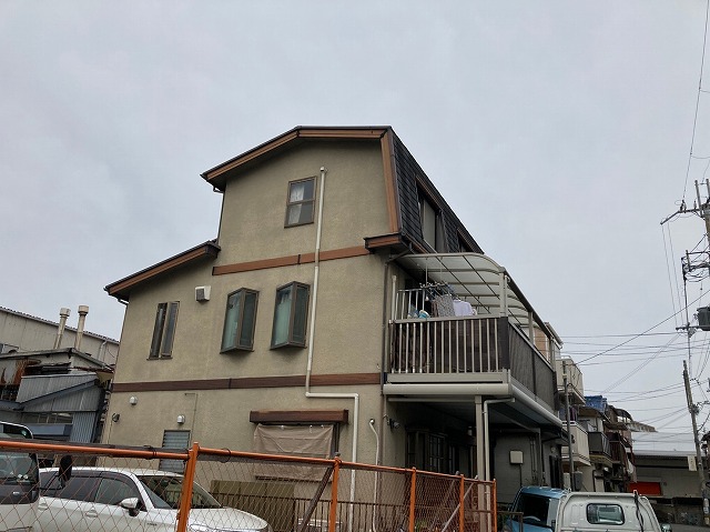 八尾市で築40年以上の戸建て住宅の外壁タイルが落下したので、外壁タイルの撤去を行うために足場組立を行いました。外壁タイルは写真中央のベランダ部にあるオレンジ色の部分で一部落下した状態となっています。また、玄関上の庇も大きな亀裂があり、庇も落下の危険がある為、補修を行うこととなりました。現場調査を行ったブログに ...続きを読む2021/06/30 八尾市で玄関上で雨漏りしたので無料雨漏り点検をしました