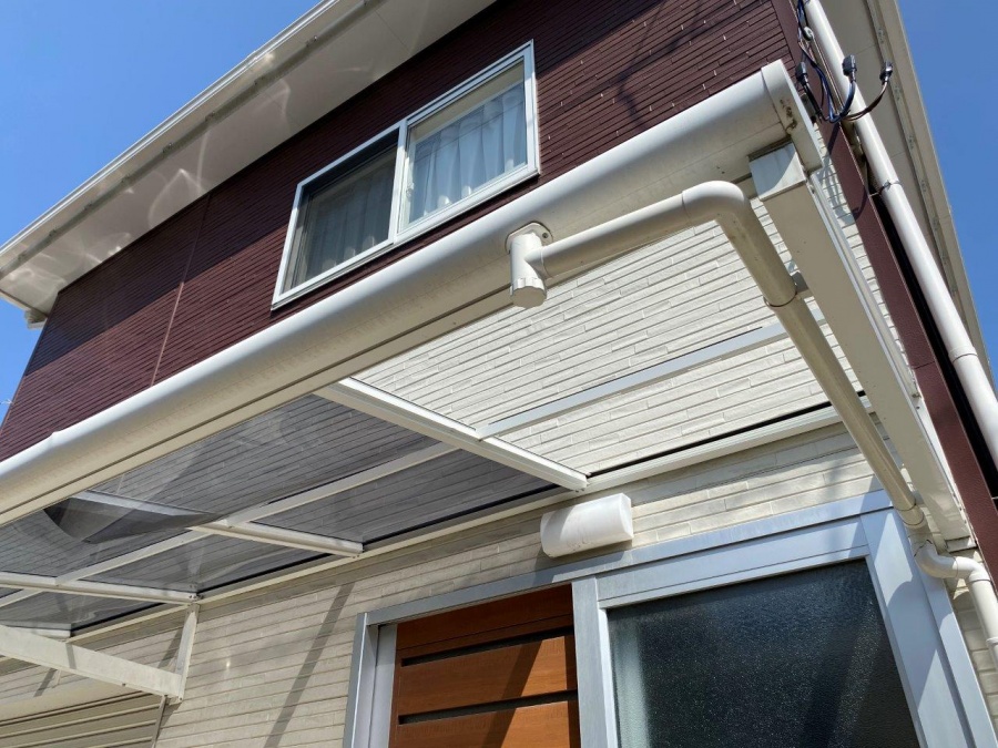新潟市東区にお住まいの方より、強風でポリカ屋根が飛散したとお問い合わせを頂きました。 早速状況を確認するために訪問してきました。剝がれ箇所以外にも歪み、変形が目立っておりましたのでお客様に確認したところ、今年初めに降った大雪の際、雪の重みによってポリカが変形したとのことです。 &n ...続きを読む2021/06/27 新潟市東区にて風害によって軒樋の破損・軒天の剥がれで現地調査を行いました