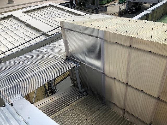 香芝市の大型工場のオーナー様より改修工事をご依頼いただき施工中です。前回のブログでは換気棟の設置、雨仕舞いとして水切り板金を設置、そして1階の下屋根にリファインルーフをカバー工法で設置しました。今回のブログでは物置や明り取りをポリカ波板を使用し補修、雨樋の交換し改修工事が完了した様子を書いていきます。 ...続きを読む2021/06/17 香芝市の工場で換気棟の設置と水切り板金を設置し雨仕舞いをしました