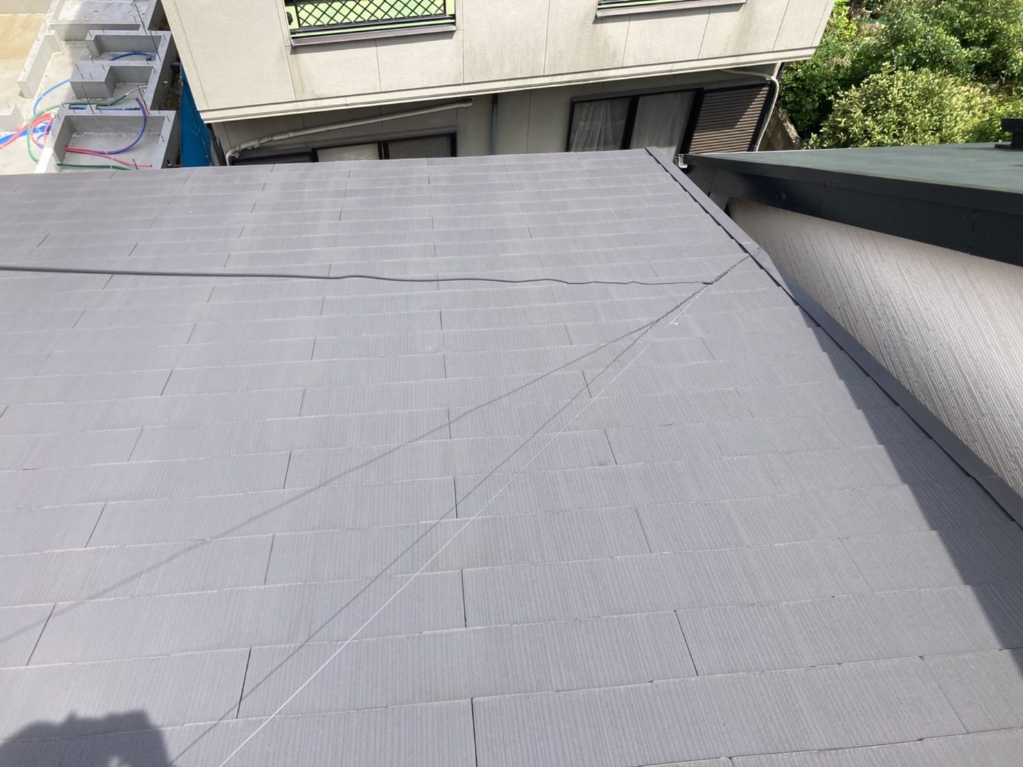 岡山市中区の店舗で雨漏り調査です。平屋の店舗で屋上の屋根上には付帯設備の設置が多数あります。屋根は大型建築で多く採用されている折板屋根です。屋外に梯子の設置がありました。利用させていただき、屋根上に上がりました。雨漏り箇所には大きな設備機器が設置されています。 こち ...続きを読む2021/06/5 新居浜市で軽量で高耐久の石粒付鋼板屋根セネターで屋根葺き替え