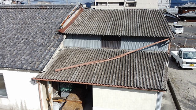 倉庫の傷んだ波スレート 四国中央市の三島で事務所と倉庫の屋根の屋根工事をしています。瓦屋根の部分はアスファルトシングルのリッジウェイで屋根葺き替え工事をして今回は隣接する倉 ...続きを読む2021/06/4 新居浜市のセメント瓦屋根葺き替え工事で瓦解体と屋根下地工事