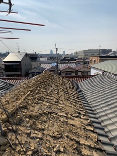 雨漏りしていた和瓦の寄棟屋根 西条市で雨漏りしていた和瓦屋根の雨漏り補修工事をしています。前回のブログでは雨漏り原因の「のし積み棟」を解体撤去する工程と雨漏り箇所の説明をさせていただきました。>>前回のブログはこちら今回は棟の復旧工事の様子をご紹介します。 ...続きを読む2021/06/8 砥部町で雨漏りしていた和風セメント瓦を軽量屋根材に葺き替え工事