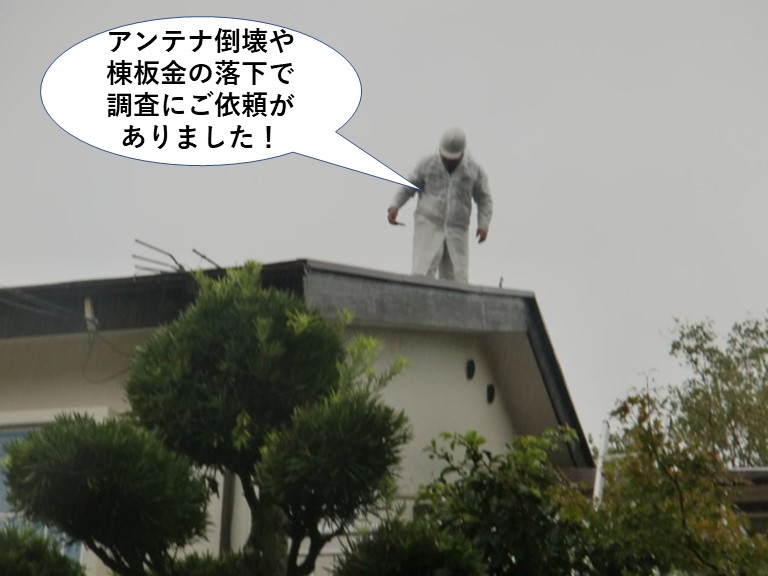 入間市のお宅より、何となく屋根を見上げたら屋根瓦の欠損しているようだと点検依頼がありました。屋根に上がってみたら欠損した大きな瓦が滑り落ちています。地上に落下してしまっていたら大事故になる可能性がある危険な状況!簡易補修をして、屋根リフォームの見積り依頼にご対応いたしました。 ...続きを読む2025/10/4 和泉市で隅棟が崩れて瓦の破損やアンテナの倒壊の被害がありました