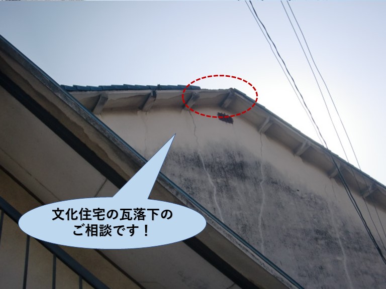 こんにちは、沼津市の街の屋根やさん沼津店です。今回は、三島市内の田園地帯に建つ住宅の雨樋清掃と補修、外壁塗装の工事をご紹介します。「最近、雨が降ると軒先から水があふれるようになった」とご相談いただき現地調査を実施したところ、雨樋(軒樋)に大量の土と落ち葉が詰まっている状態が判明しました。 ...続きを読む2025/10/4 岸和田市で強風で文化住宅の袖瓦が落下!鬼瓦も粉々になっていました