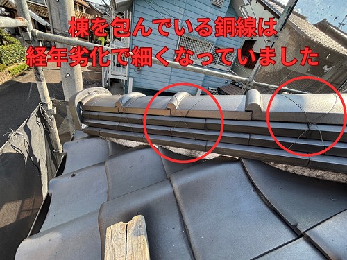 隅棟の積み直し工事を開始します! 雨による崩れはありませんでしたが、今回のお宅の屋根には隅棟が1本だけあり、その長さも短めでした。そのため、耐震性を高める目的も含めて積み直し工事を行うことになりました。銅線が経年劣化で細くなってきていました。銅線は年々細く ...続きを読む2025/10/3 【菊池郡菊陽町】中断された瓦屋根の葺き替え工事|適切な材料と施工で雨漏りの不安を解消!