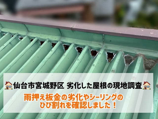 宇都宮市で瓦棒屋根の部分葺き替え工事をしました 施工前の屋根の状態です 2軒の家を繋いでいる通路部分の屋根が 錆びて雨漏りがあるので葺き替えて欲しいとのご要望です また 雨漏りで ...続きを読む2025/10/3 【仙台市宮城野区】雨押え板金の劣化やシーリングのひび割れを確認!現地調査の様子をご紹介!