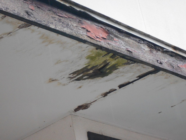 2021/06/2  大垣市 庇の軒天ベニヤに全体にシミが広がっています。庇屋根・軒天・鼻隠し(劣化調査)