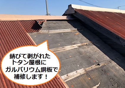 2021/05/28  石巻市泉町│SGL鋼板を現場加工して瓦棒葺きトタン屋根のサビ穴部分をカバー補修