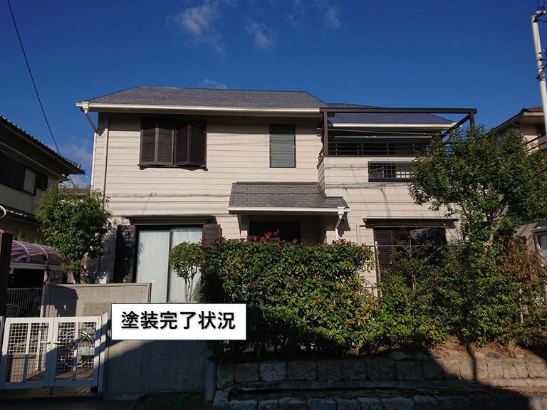貝塚市の外壁塗装のご紹介です。N様邸はこの工事で台風で飛散した棟板金を交換しカラーベストの塗装も行いました。外壁はサイディングで、表面に施されている塗膜が劣化して剥がれる現状、チョーキングを起こしていてそろそろ塗り替えの時期に来ていました。また、外壁の継ぎ目などを防水しているシーリングも傷んで割 ...続きを読む2025/10/2 貝塚市の屋根塗装で中塗りと上塗りの色を変えて塗装しました