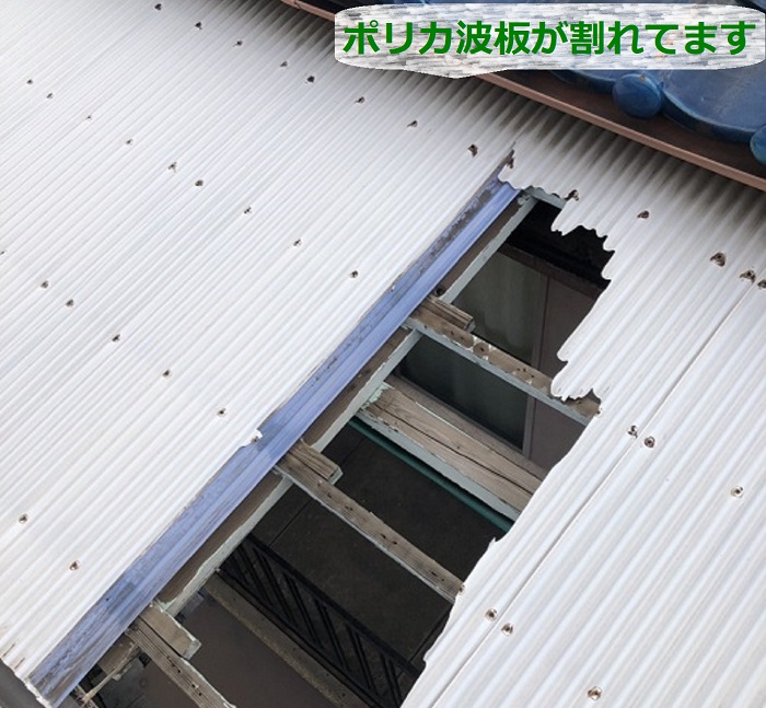 泉南市のベランダに設置されているテラスの波板張替え工事を行いました。台風で屋根の瓦が動いて下にあるテラスの波板の上に落ち、数カ所に穴が開いている状態です。既存の波板は塩ビ波板(塩化ビニール製)で、経年劣化で継ぎ目が変形しており、茶色く変色してきていたのですべて張替 ...続きを読む2026/02/19 熊取町の化粧スレート屋根の一部が野地板ごと飛散し調査に伺いました