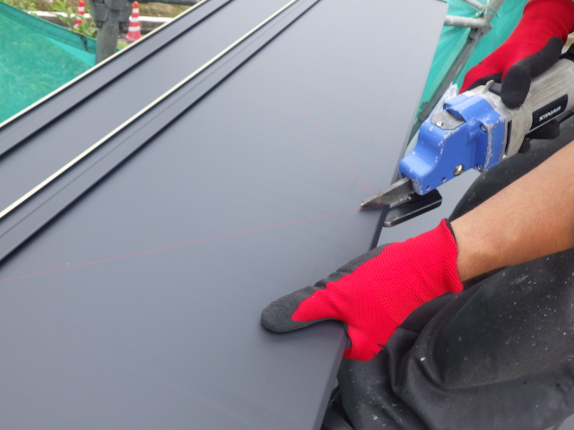 壬生町の屋根カバー工事で役物板金を取り付けました 横暖ルーフの加工中です 昨日の1面だけ残った 東面のルーフを貼り付けていきます 棟の角度を映して墨を引いてから 電動はさみでカットしました ...続きを読む2025/09/27 三春町にて雨漏りの原因となった棟板金の交換工事。部分交換工事も対応可能