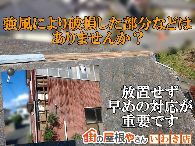 光市にお住まいのお客様より、屋根のメンテナンスのご依頼をいただいたことから、屋根リフォームを行うことになりました。本日の現場ブログでは、光市で行った屋根カバー工法による屋根のメンテナンスの様子を紹介します。「お客様に最高のリフォームを届けるための街の屋根やさんの10のお約束」はこちらをご覧ください ...続きを読む2025/09/27 いわき市にて強風により破損した屋根の工事。強風関連の事例をいくつか紹介!