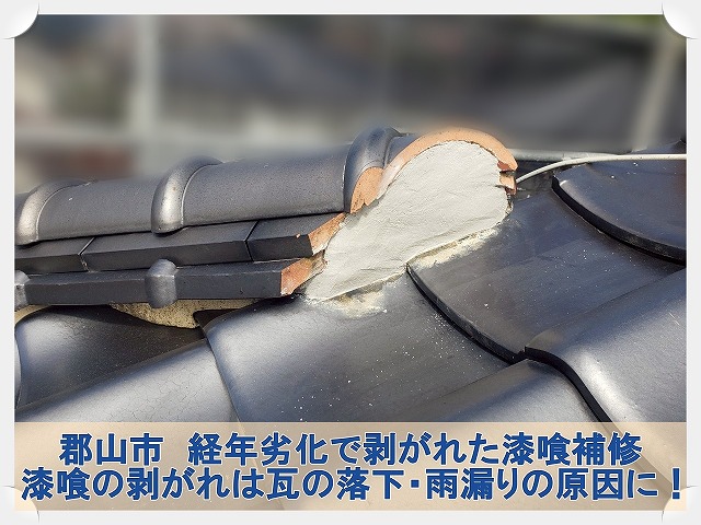 お客様からのご相談と現地調査 岐阜県可児市のお客様より、「近所の人に棟に草が生えていると指摘され、心配になったので一度見てほしい」とのご相談をいただきました。 屋根のメンテナンスは定期的に行うことが大切ですが、普段はなかなか気づきにくい部分も多いため、こう ...続きを読む2025/09/27 郡山市にて経年劣化により剥がれてしまった漆喰の詰め直しによる屋根修理工事を実施