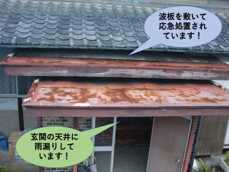 高石市のK様より雨樋の詰まりのご相談があり現地調査にお伺いすると、2階の軒樋(横方向の雨樋)と、下屋の軒樋がつまり、樋の中に水が溜まっている状態でした。調査の時に集水器(雨水を集めて竪樋に送る桝)の落ち口の部分に溜まった枯れ葉を取り除くと水がちょろちょろと流れたので、竪樋は詰まっていないようでした。 ...続きを読む2025/09/26 泉北郡忠岡町の玄関天井の雨漏りで錆びついた玄関庇に問題がありました!