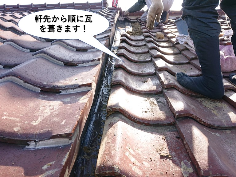 貝塚市M様邸の雨漏り修理で大屋根(一番高い屋根)の棟瓦積み直し工事を行うことになりました。既存の棟瓦をめくって解体し、シルガードを載せてのし瓦を葺いていきます。シルガードとは漆喰のことで、防水材が含まれた耐久性のある漆喰になります。棟の一番下にシルガードを敷くと、瓦の下地と面戸漆喰が一体になり、崩れにくく長持 ...続きを読む