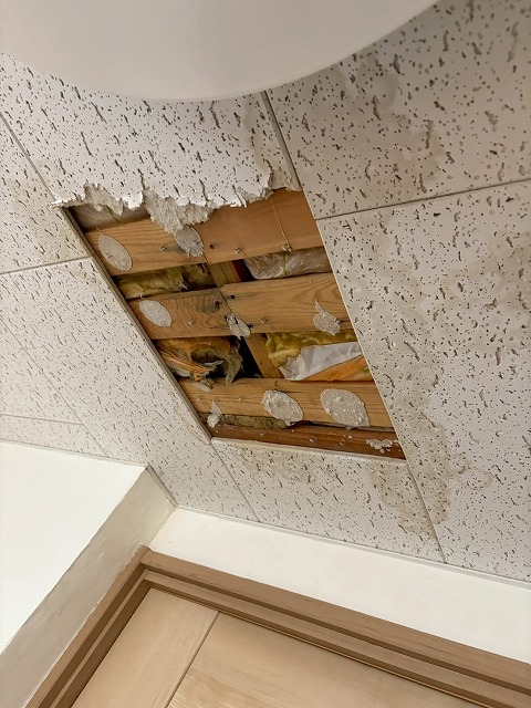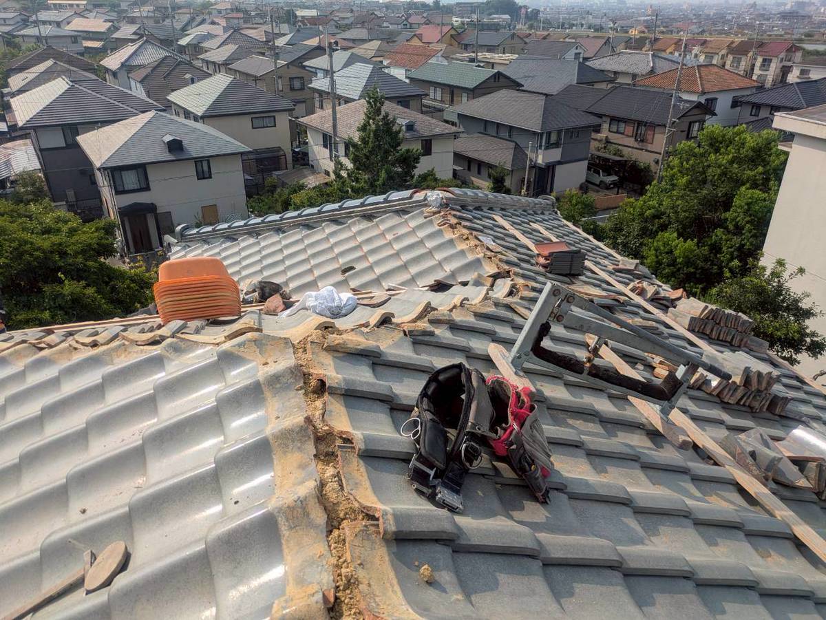大東市にて貸し倉庫を所有されているオーナーさまから、「雨樋が壊れてしまって雨水がきちんと流れない」とのお問い合わせをいただきました。調査に伺ったところ、雨樋だけでなく屋根材のスレートも破損している状態です。経年劣化に加えて台風などの強風が影響したと考えられます。今回は雨樋交換と屋根の修繕をあわせてご提案させて ...続きを読む2025/09/23 東大阪市で雨漏り被害により室内天井が一部落下しご相談、瓦屋根の経年劣化・ズレにより葺き替え工事をご提案