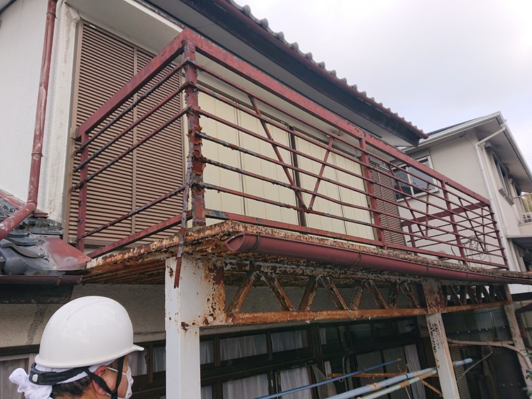 こんにちは。街の屋根やさん名古屋南店です。 前回のブログでは、名古屋市南区の住宅にて実施した雨漏り調査について、その様子をお伝えいたしました。 今回は、雨漏りの原因となっていた木製造作ベランダの撤去について、その施工の様子をご紹介したいと思います。▼前回までのブログ・名古屋市南区で木製の造作ベランダ周辺で雨漏 ...続きを読む2025/09/22 貝塚市の玄関庇の塗装のご相談で錆が発生していました!