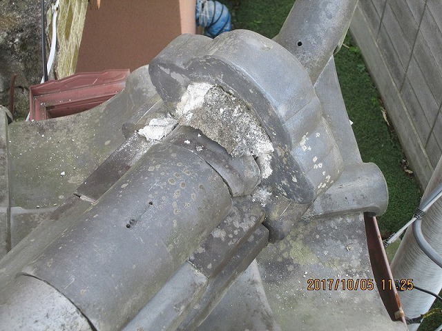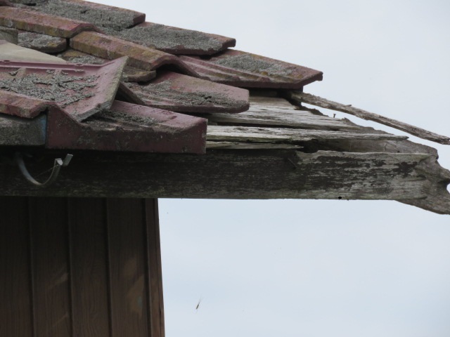 こちらは棟(むね)の先の鬼瓦部分の写真です。見て頂いた通り、棟瓦がずれていて鬼瓦と棟瓦を固定させるための漆喰がわずかな部分を残し、すべて取れてしまっています。触ると鬼瓦がグラグラします。直ぐにでも取れてしまいそうな状態です。新たに漆喰を入れなおさなければなりません。 ...続きを読む