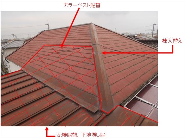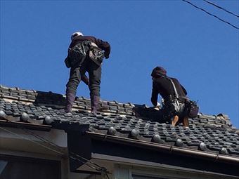 調査②に引き続きのご説明です。屋根四隅付近の瓦のズレが特にひどい状態だった端から、5列目までの瓦の調整を行いズレを修正。その後、瓦棒と呼ばれる半丸瓦が敷かれる場所は、棟の部分と同様に、並んだ瓦と瓦の間に隙間があるため雨水が浸入しないよう漆喰を詰め直します。 ...続きを読む